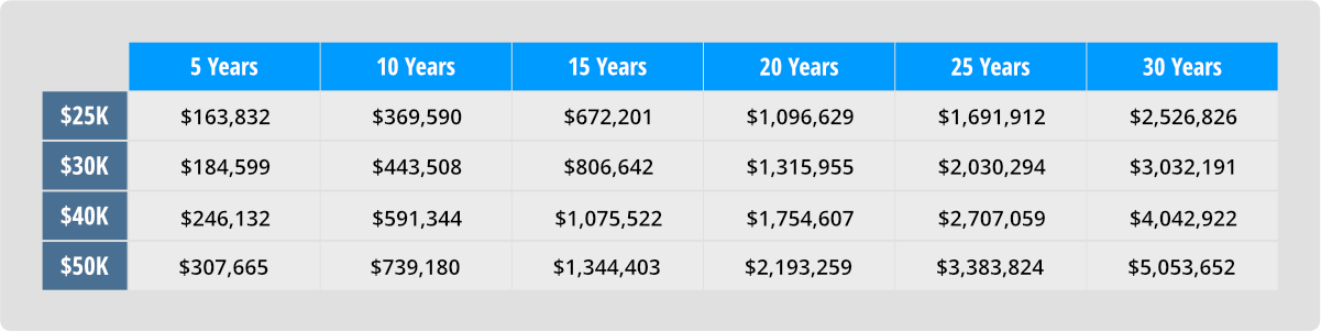 By contributing just an average of $30,000 each year, you’ll have over $6.4 million waiting for you when you’re ready to retire!